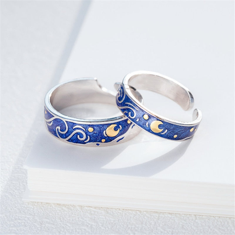Estrela da lua noite estrelada van gogh anéis ajustáveis para o casal amante do preço real s925 prata 2020 transporte da gota